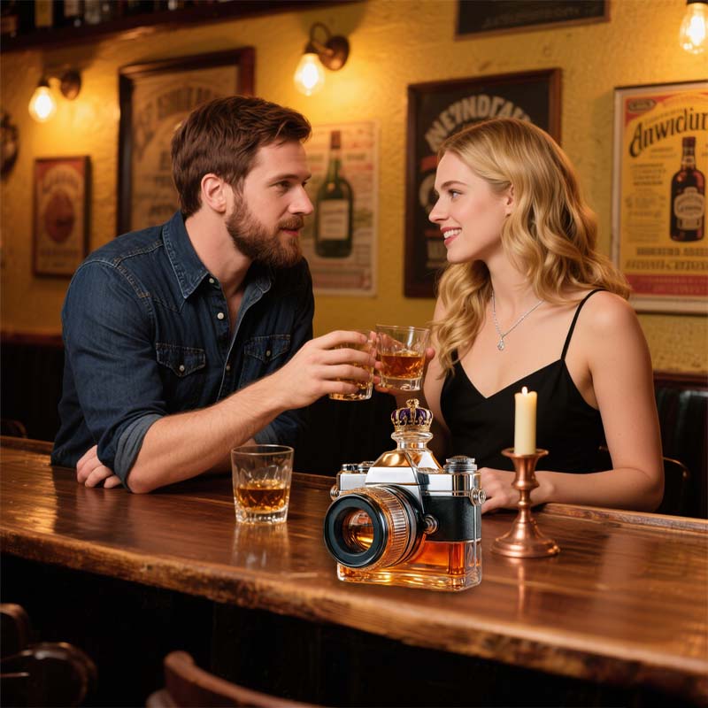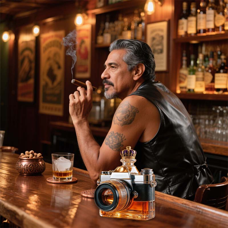 Sirve con estilo con este decantador de vidrio inspirado en una cámara, que combina arte y funcionalidad. Diseñado para coleccionistas, fotógrafos y entusiastas, aporta un toque único a tu barra o decoración del hogar.